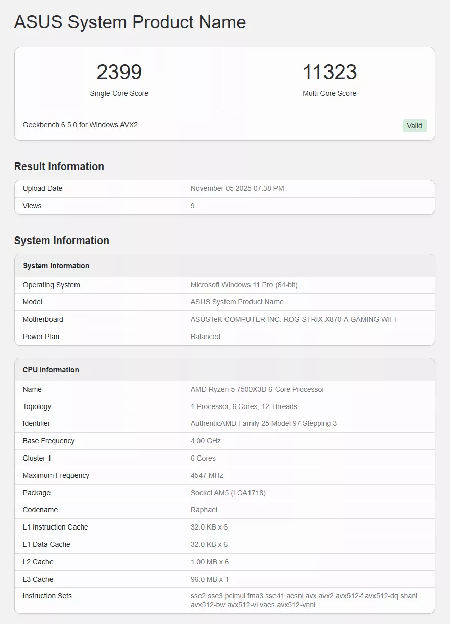 The Ryzen 5 7500X3D has been tested on an ASUS ROG Strix X870-A Gaming WiFi motherboard. According to reports, the processor delivered a single-core score of 2,399 and a multi-core score of 11,323 on Geekbench. These results place it slightly behind its sibling, the Ryzen 5 7600X3D, which scores approximately 8% higher in both categories. Averaging around 2,600 in single-core and 12,000 in multi-core tests, the 7600X3D sets a high bar. However, the differences in scores between the two processors are not drastic and could vary depending on different test conditions.