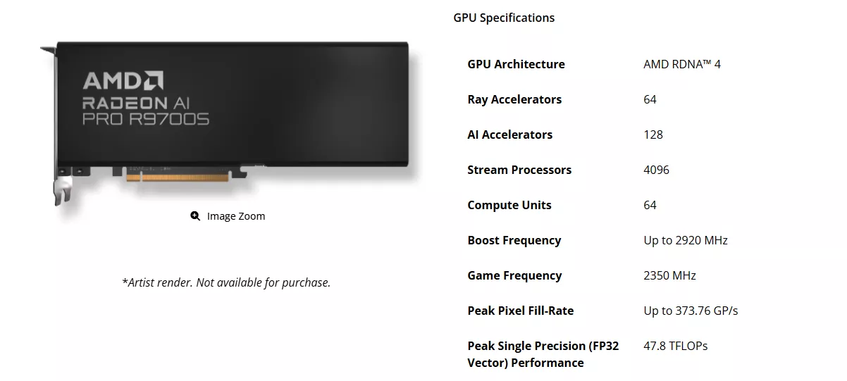 The R9700S model maintains high performance with a boost clock of up to 2920 MHz, 32 GB of GDDR6 memory, and a 256-bit memory bus, all housed in a 2-slot passive cooling design. Despite the lack of active cooling, it still supports 47.8 TFLOPS of FP32 compute performance, comparable to its predecessor.