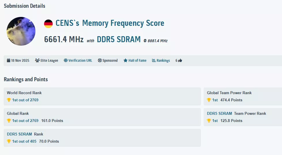The latest triumph comes courtesy of German overclocker “CENS,” who has claimed the top spot on the HWBot DDR5 OC leaderboard. Utilizing the ASUS ROG Maximus Z890 APEX motherboard combined with the G.Skill Trident Z5 24 GB DDR5 memory module, CENS achieved a remarkable 6661.4 MHz or 13,322.8 MT/s. This achievement represents a significant leap of nearly 111 MHz over the previous speed record.