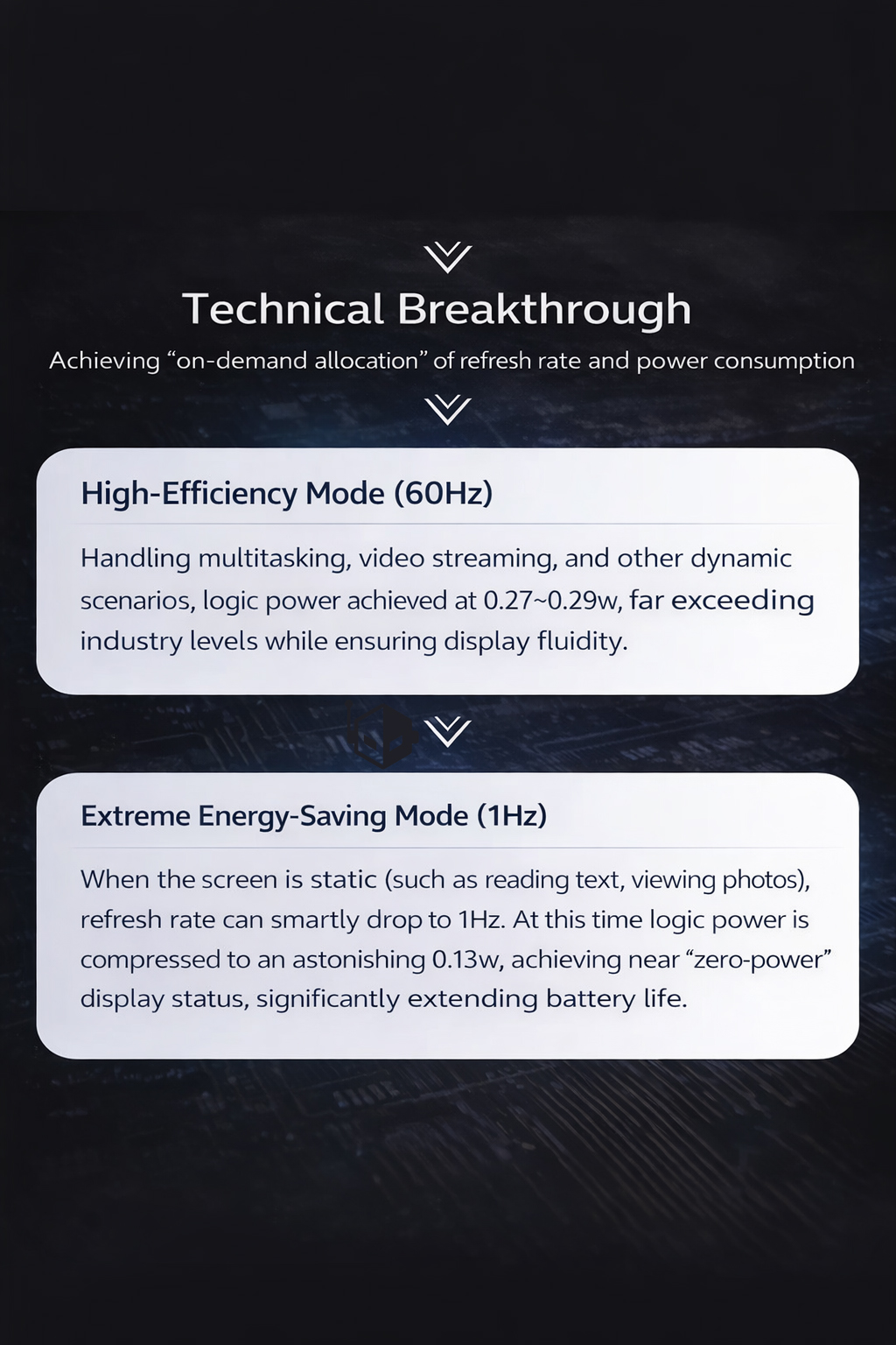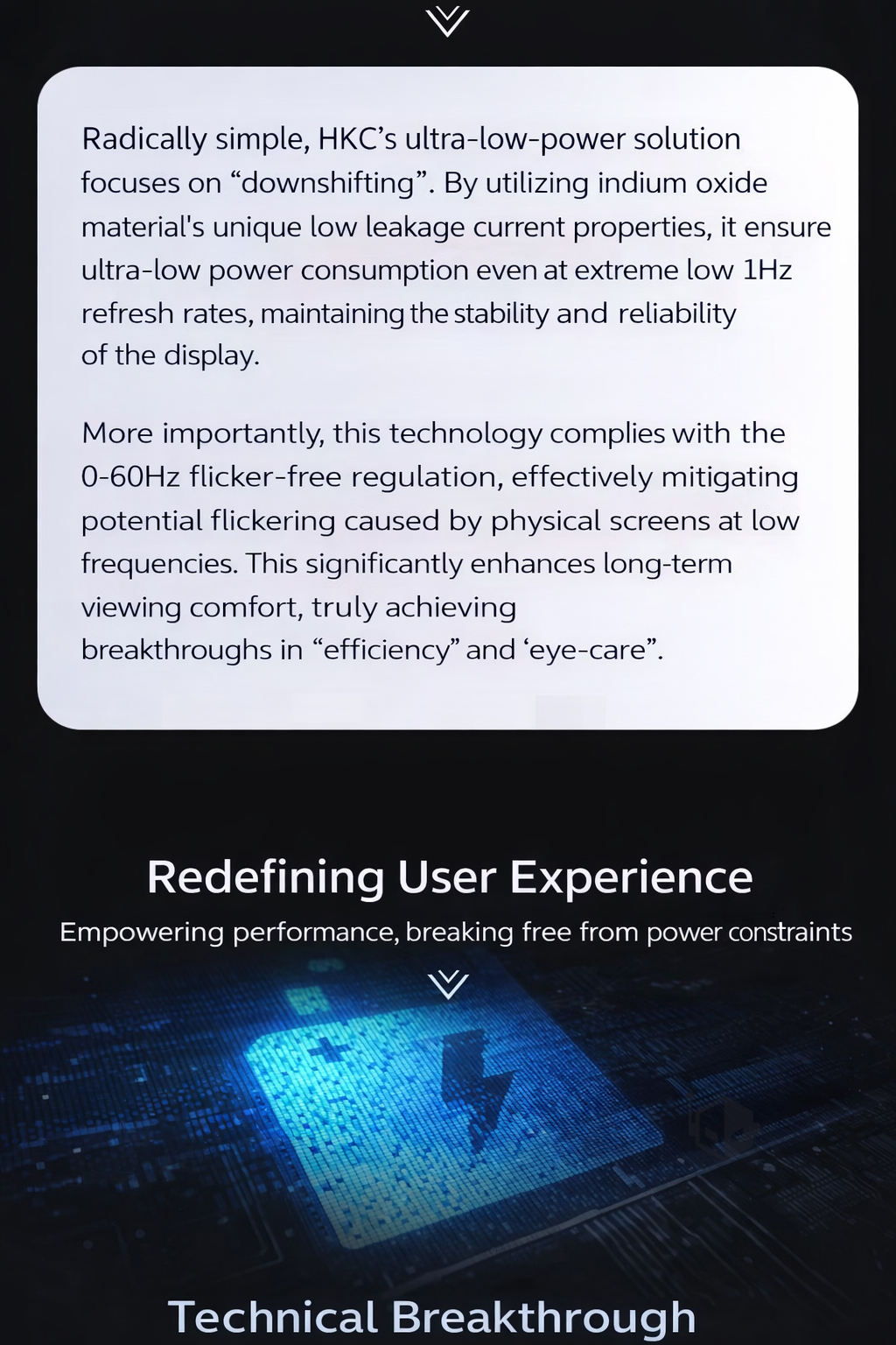 The heart of HKC’s technology lies in its use of indium oxide material, which effectively minimizes current leakage, enabling ultra-low power operation without causing flicker. The display functions efficiently at 0.27-0.29 W at 60Hz, but can dramatically reduce power usage to just 0.13 W when the refresh rate drops to 1Hz. This significant reduction in power consumption can greatly enhance the battery life of laptops, allowing them to operate longer between charges.