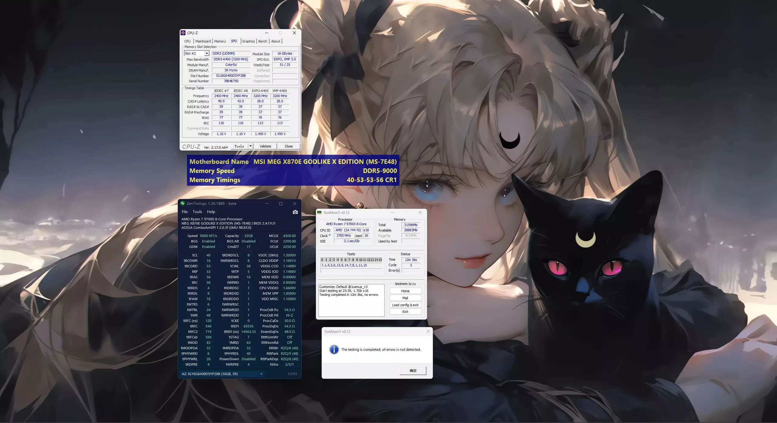 The testing continued with an AMD Ryzen 7 9700X processor, enabling the same 32 GB DDR5 kit to achieve a staggering 9100 MT/s with timings of 40-53-53-56 CR1. Moreover, stability tests confirmed the kit’s reliability at DDR5-9000 speeds, reinforcing the motherboard’s capability to handle extreme conditions.