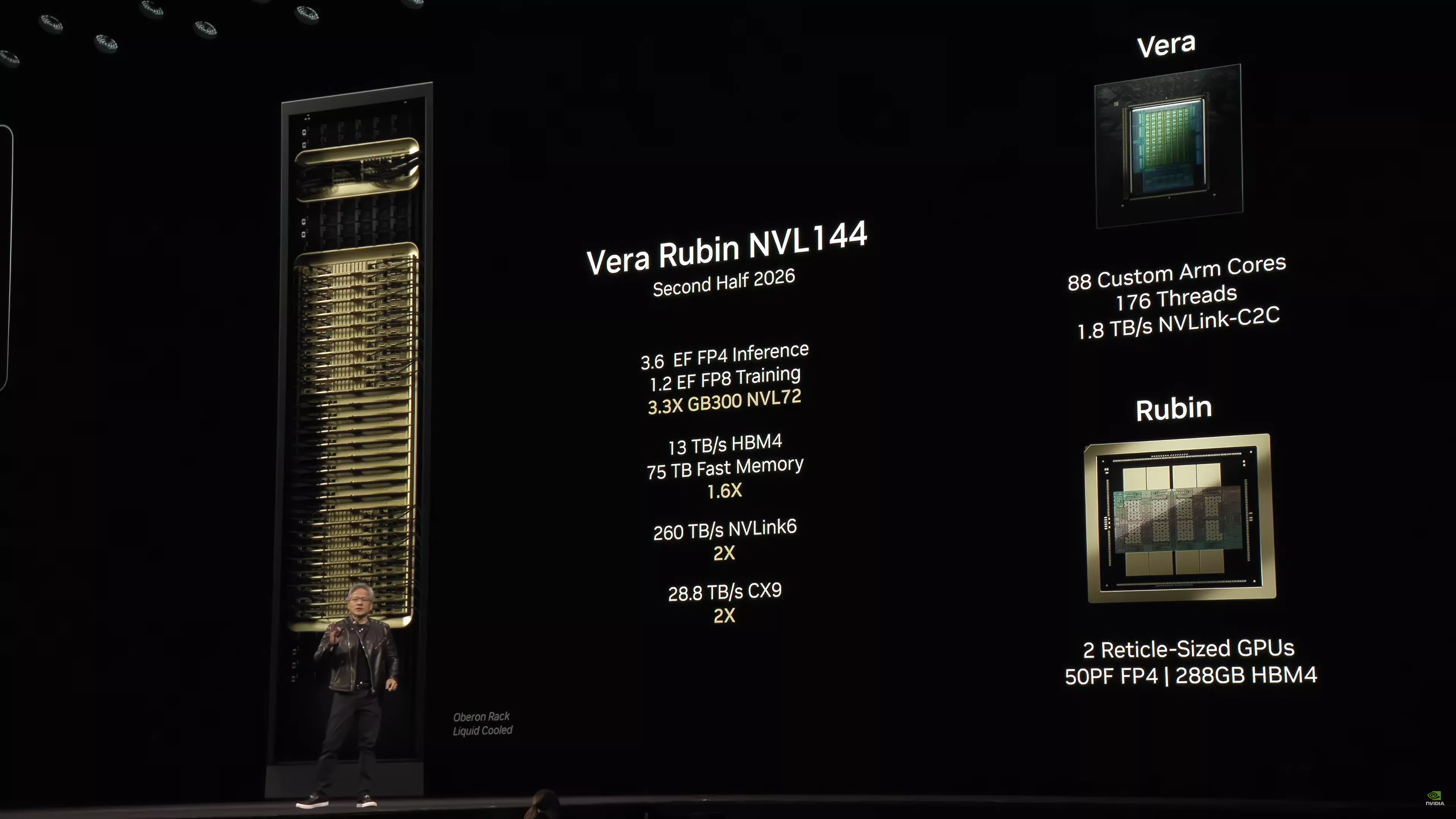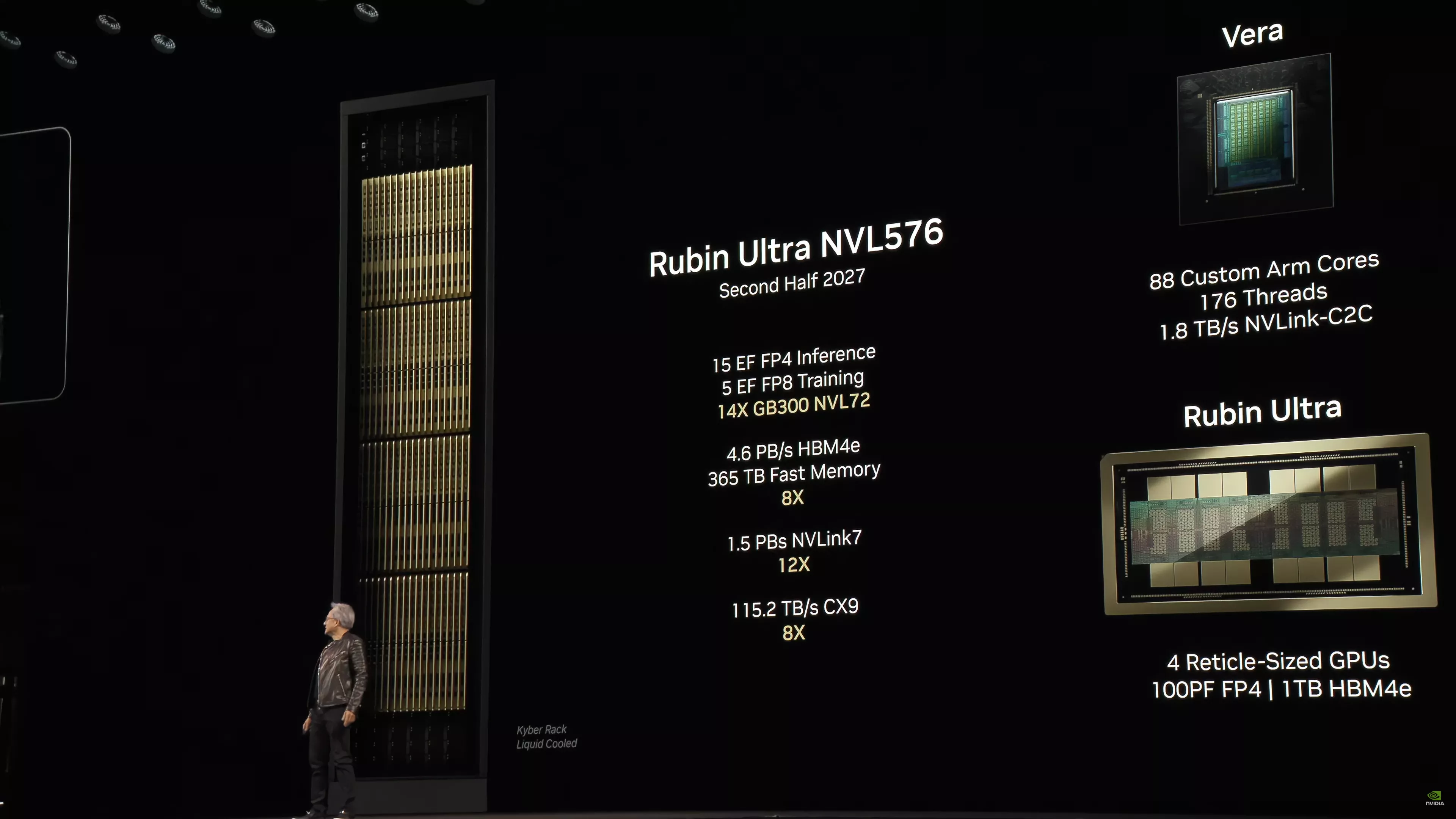 Expectations are high for the NVIDIA Vera Rubin NVL144 platform set to launch in the second half of 2026. The platform will host two new Rubin GPUs, each with two Reticle-sized chips, delivering up to 50 PFLOPs of FP4 performance and equipped with 288 GB of next-gen HBM4 memory. It also includes an 88-core Vera CPU, offering a custom Arm architecture with 176 threads and 1.8 TB/s NVLINK-C2C interconnect.