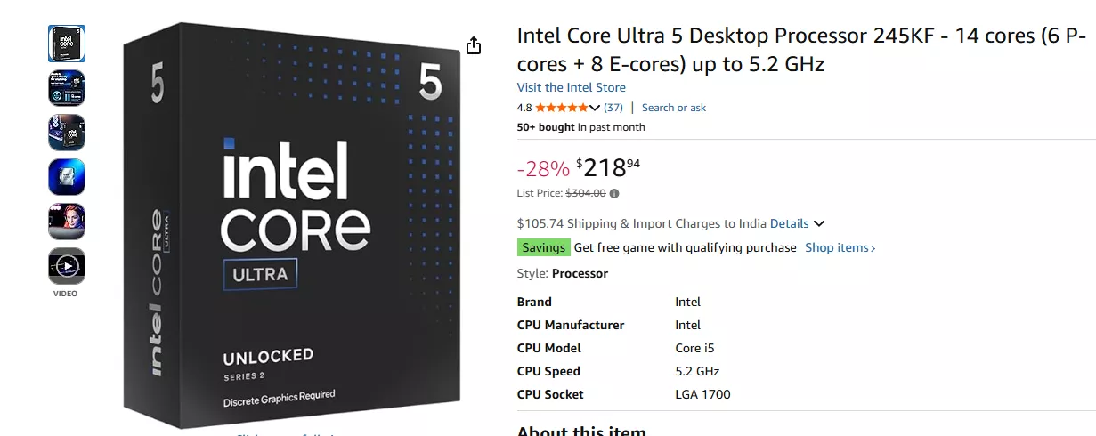 - Intel Core Ultra 5 245KF: $218 on Amazon, $218 on Newegg