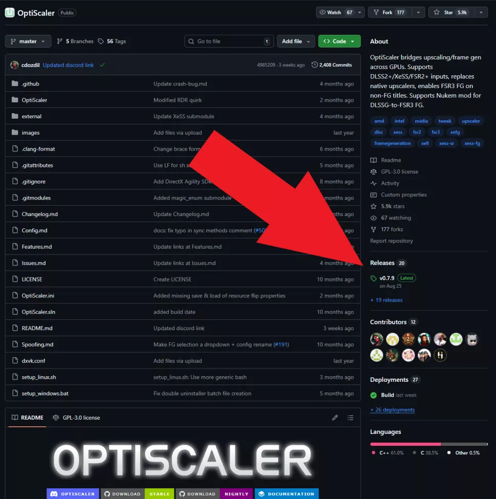 To install Optiscaler, download the mod from [here](https://github.com/optiscaler/OptiScaler). Navigate to “Releases” and download the Optiscaler.7z package. Avoid downloading the source code.